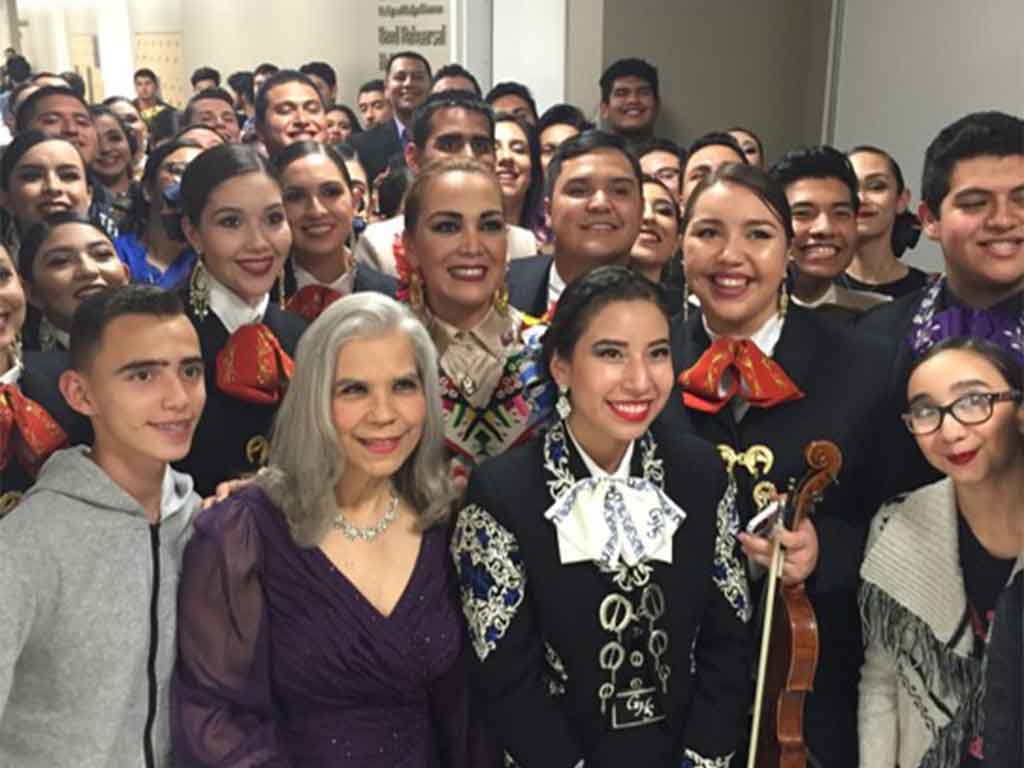 Aida Cuevas with Dr. Guerra and excited students on La Reyna del Mariachi’s first visit to UTRGV in 2016.