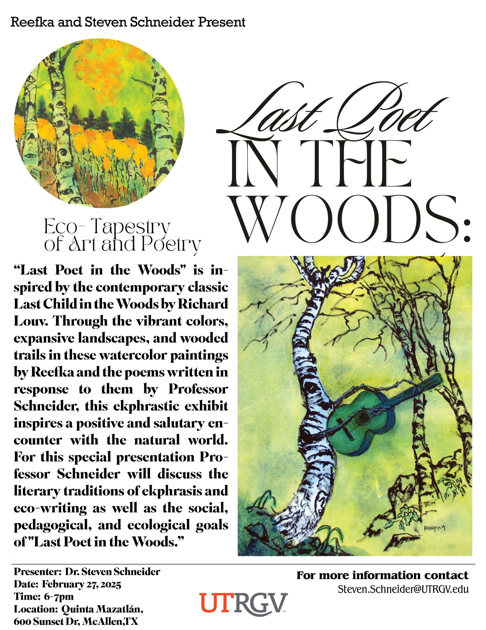 For this special presentation Professor Schneider will discuss the literary traditions of ekphrasis and eco-writing as well as the social, pedagogical, and ecological goals of “Last Poet in the Woods.”